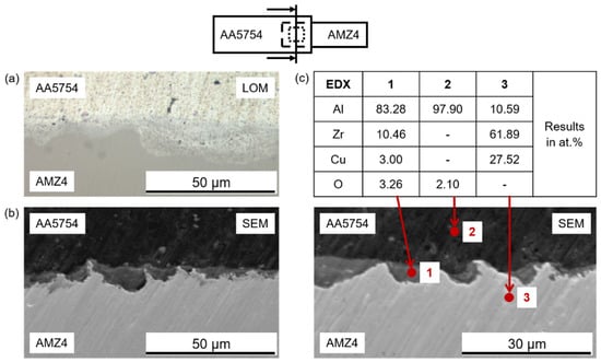 Further investigations include analyses by light optical microscopy (LOM) and scanning electron microscopy (SEM). Figure 11a shows an optical micrograph of a cross-section at the interface. No straight interface was visible; instead, there seemed to be a mechanical interlocking of both materials. The soft aluminum appeared to be pressed into the surface structure of the harder AMZ4, creating large surface area of contact. The SEM images confirms this observation (Figure 11b). The cross-sections are additionally characterized by EDX spot measurements. The results are displayed in atomic percentage in the table of Figure 11c. The elemental distributions show an apparent discontinuous “intermediate layer” between the Al alloy and the metallic glass. The EDX analysis (point 1) suggests that it is Al-rich and contains some Zr and Cu. However, the regions are too small to exclude that some of the AMZ4 was inside the excited area contributing to the signal, thus producing an apparent Zr and Cu content that is not existing. It is, in fact, unlikely that within the short processing time of a few seconds considerable mixing between the alloys takes place. It is therefore also possible that the contrast in the micrographs results from the fact that this material is heavily deformed aluminum, which is locally pressed into the metallic glass. The EDX analyses of the two alloys (points 2 and 3) fit well with nominal concentrations in the alloys.