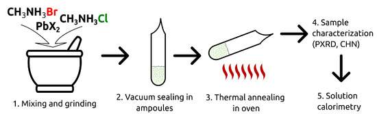 Schematically, the synthetic procedure is presented in Figure 1. The stoichiometric amounts of the binary halides were mixed, carefully ground in an agate mortar, and placed into evacuated and hermetically sealed glass ampoules. The ampoules were heated in an oven at T = 423−463 K for a period of 2–5 days (no significant differences in the result of the synthesis were noticed within the indicated temperature range). After an exposure at the specified temperature, the ampoules were quickly ejected and cooled to room temperature. The as-obtained samples were stored in a vacuum desiccator under P2O5.