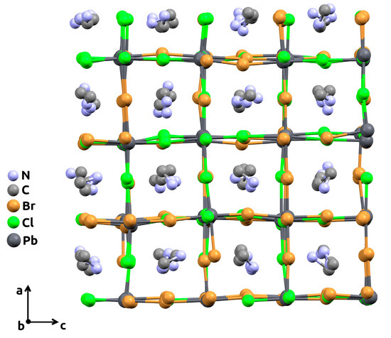 The 4 × 4 × 4 supercell (view along the crystallographic b-axis) with mixed chlorine-bromine content (x = 0.5), obtained after molecular dynamics simulation procedure. Hydrogen atoms are omitted for clarity.