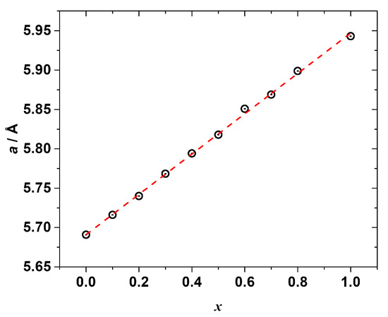 where Equation (3) was used for compositions with x ≤ 0.3, Equation (4) for 0.4 ≤ x ≤ 0.6, and Equation (5) for x ≥ 0.7.