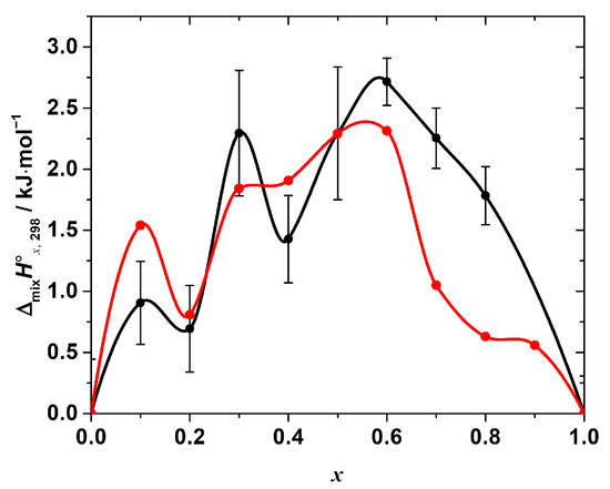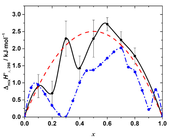 As seen in Figure 4, the enthalpy of the mixing is positive over the entire range of the compositions with the maxima at x = 0.1, 0.3, and 0.6, i.e., the ΔmixH°x,298-composition dependence apparently has a complex, non-monotonic nature. The positive mixing enthalpy indicates that the formation of the solid solutions is not an energetically favorable process, at least from the point of view of the enthalpy contribution to the Gibbs free energy change. Moreover, obviously, such simple models as, for example, the regular solution one: