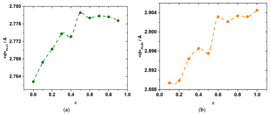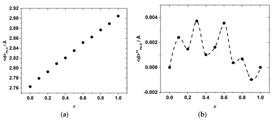 This correlation can be seen more clearly on the excess bond length, <d>exPb–X, dependence plotted in Figure 7. The overall average Pb–X bond length, in turn, gradually increases with x, as seen in Figure 7a, whereas the excess bond length, <d>exPb–X, shows some oscillations again with characteristic minima at x = 0.2, 0.4 and 0.7–0.9, as demonstrated in Figure 7b.