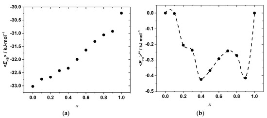 The calculations were carried out in the following way. First, the pairs of the H and X atoms, for which the distance is less than the sum of the Van der Waals radii of the elements, were identified. They were assumed to be bonded by hydrogen bonds. Then, for each pair of the atoms, the hydrogen bond energy was calculated using the potential function mentioned above. The computed energies were averaged for each composition and reduced to the energy per mole of the solid solution, <EHB>. Similarly to the mixing enthalpy (Equation (14)) and the mean Pb–X bond length, the excess hydrogen bond energies were calculated as follows: