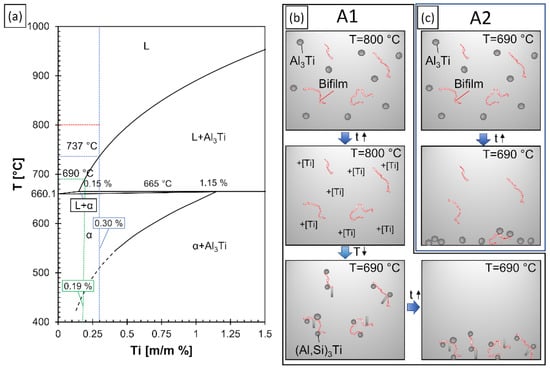 (a) The aluminum-rich section of the Al–Ti binary phase diagram (adapted from []), (b,c) schematic illustration of particle and bifilm settling during the experiments.