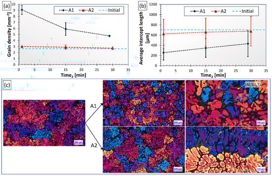 The results of the grain size analysis are summarized in Figure 2. Figure 2a,b present the evolution of average grain number density and average intercept length results, while Figure 2c shows microstructural images of the samples cast before and after Al-10%Ti addition for both experiments. The initial grain density and intercept length values measured on the control samples are represented by blue dashed lines for easier comparison.