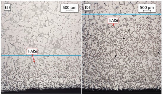 Figure 4 shows the optical micrographs of the settled TiAlSi particle-rich bottom section of the samples solidified in the crucibles. In the figure, blue lines are used for the visualization of the maximum height where grain refiner particles are found. Table 2 presents the results of the analysis of the height of particle-rich zones.