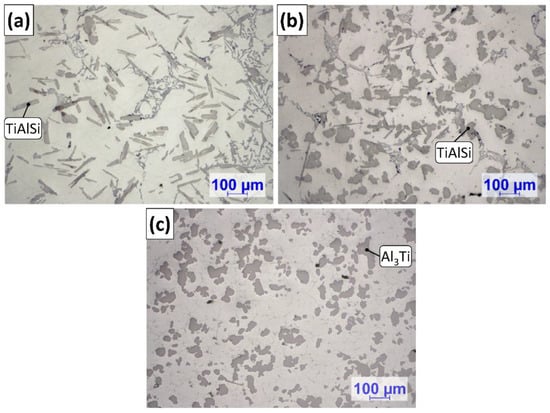 - Chen, X.; Fortier, M. Formation of Primary TiAlSi Intermetallic Compounds in Al-Si Foundry Alloys. In Proceedings of the 9th International Conference on Aluminium Alloys, Brisbane, Australia, 2–5 August 2004; Nie, J.F., Morton, A.J., Muddle, B.C., Eds.; Institute of Materials Engineering Australasia Ltd.: North Melbourne, VIC, Australia, 2004; pp. 659–665. [Google Scholar]