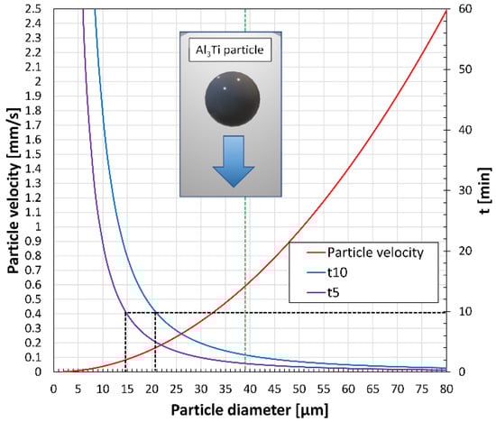 where is the terminal velocity of the settling particle [cm/s], is the radius of the spherical particle [cm], is the density of particles (3.130 g/cm3 for Al3Ti []), is the density of the liquid alloy at 690 °C (2.385 g/cm3 []), is the acceleration due to gravity (981.7 m/s2), and is the viscosity of the liquid alloy at 690 °C (0.0104 g/cm·s []). Figure 6 presents the calculated settling velocities as a function of particle diameter indicating the average equivalent diameter of the Al3Ti particles inside the Al-10%Ti master alloy (~39 μm). Based on the terminal velocity values, the time needed to settle 5 and 10 cm (t5 and t10) was also calculated. The reason for this is that during the experiments, the total height of the melt was around 10 cm after Ti addition. However, a settling distance of a few centimeters could also result in the low Ti concentration measured during the A2 experiment (Table 1), as the OES sample was taken from about 3–4 cm below the melt surface.