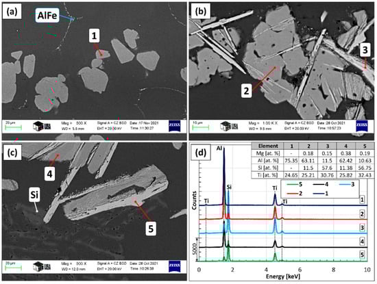 Figure 7 shows the SEM images of the grain refiner particles found in the Al-10%Ti master alloy (Figure 7a), as well as in the samples solidified in the crucible during A1 (Figure 7c) and A2 experiments (Figure 7b). The results of the EDS analyses are given in Figure 7d. Based on the SEM investigation and the EDS analyses, the chemical composition of the grain refiner particles in the master alloy is homogeneous and follows the Al3Ti stochiometry (75 at.% Al and 25 at.% Ti, point 1 in Figure 7). On the contrary, the particles created during the two experiments consist of two phases: an (Al,Si)3Ti phase that is lower in Si and Ti (points 2 and 4 in Figure 7), as well as a phase that has a relatively high Si-concentration (around 57 at.%, point 3 and 5 in Figure 7). Based on the results of our previous studies [,] and references [,,], the latter is the τ2 phase, which is created by the transformation of the (Al,Si)3Ti during the slow cooling of the samples.