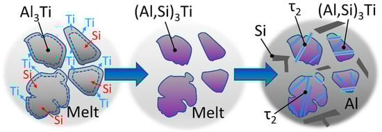 It can be seen in Figure 7b, that the parts of the particles that transformed to τ2 have a lamellar morphology. Based on this, the particles created during the A2 experiment differ from their original blocky morphology due to the phase transition to τ2. Ma et al. [] reported that under equilibrium conditions, τ2 can appear as a result of the reaction in the case of alloys with similar Si concentrations as in our case. This is realized via the diffusion of Si atoms into the (Al,Si)3Ti particles, as well as the local enrichment of Si and Ti atoms inside the particulates. This results in the formation of a lamellar structure inside the blocky (Al,Si)3Ti particles. This reaction is commonly suppressed during the solidification of cast alloys and composites due to non-equilibrium cooling conditions. The transformation can be also realized via solid-state transformation, which is a slower process and can be neglected in our case. The transformation sequence of the Al3Ti particles introduced to the liquid alloy during the A2 experiment is summarized in Figure 8.