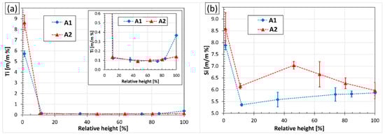 (a) Ti- and (b) Si-concentrations as a function of relative height in the samples solidified in the crucible during the experiments.