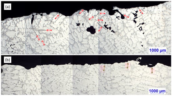 Optical micrograph of the top region of the (a) A1 and (b) A2 samples, indicating the places where TiAlSi particles were found.