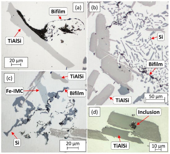 During the microscopic examination of the bottom region of the A1 sample, numerous crack-like bifilms were found, which were connected to Si, Fe-rich intermetallic, and TiAlSi compound particles (Figure 11). In one case (Figure 11d), an inclusion was also found inside a TiAlSi particle, which appears to be an agglomerate of inclusion particles; however, it could also be a bifilm that was raveled up into a compact form. Figure 12 presents the SEM images of two bifilm defects found in the sediment zone (Figure 12a,c) and the results of the EDS analysis made at the indicated points (Figure 12b,d).