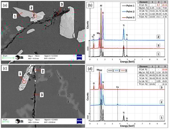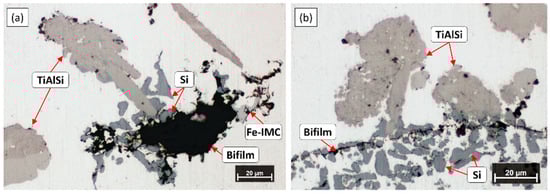 In Figure 12a, particles consisting of (Al,Si)3Ti (point 1) and τ2 (brighter regions inside the particles, point 2) are attached to the oxygen-rich crack-like feature (point 3). Based on its O- and Mg-concentration, the investigated inhomogeneity is a MgAl2O4 film, which is thermodynamically more stable than MgO or Al2O3 for the studied alloy composition and temperature []. Note that during the analysis of point 2, some parts of the darker regions inside the particle were also inside the electron-excited interaction volume, which resulted in the detection of some oxygen. Based on this, there is an oxygen-containing phase inside the investigated particle. The white particles inside the bifilm are presumably fragments of the TiAlSi compounds formed during the sample preparation.