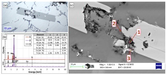 The investigated O-rich phases had rather different chemical compositions (Figure 13b): in points 1 and 2, the main constituents are O and Mg, but their ratio is different. In point 3, besides Mg and O, Sr and Ca were also found, which can be explained by the segregation and enrichment of surface-active Ca and Sr along the oxide phase.
