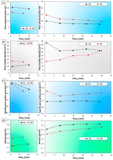 The RPT specimens cast during the experiments were investigated with X-ray computed tomography, which is reported to be a feasible method for the characterization of RPT samples by a growing number of studies [,,,,]. Three parameters were investigated: the pore volume fraction [%], the volumetric pore number density [cm−3], and the specific pore surface area [mm−1], which gives the surface area of pores present in 1 mm3 of the sample. The specific pore surface area has been named as Bifilm Spatial Index (BSI) by Song et al. [], and according to them, this metric can be considered as an improved version of the Bifilm-Index introduced by Dispinar and Campbell []. The results of the CT analysis and density measurements of RPT samples are shown in Figure 15. Figure 16 shows cross-sectional and volumetric CT images of the RPT samples taken at two different time points during the A1 experiment.
