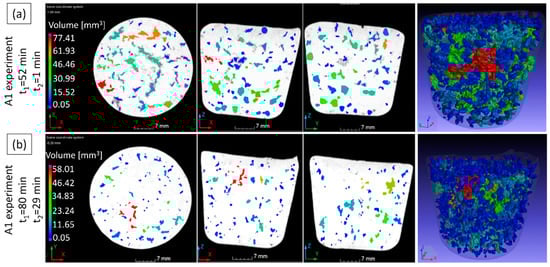 Representative CT sections and volumetric views of the pores detected in the (a) first and (b) fifth RPT sample cast after Ti-alloying during the A1 experiment.