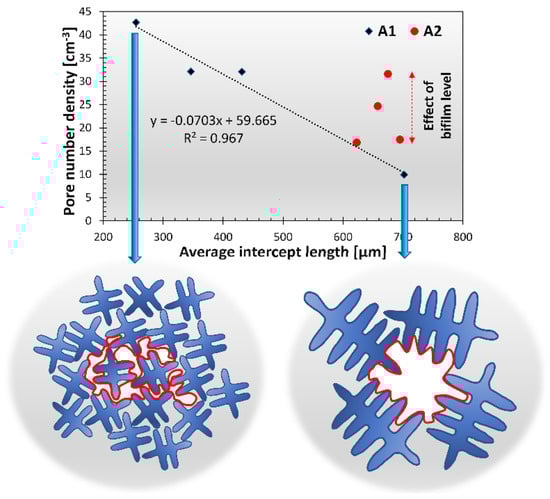 The sharp increase in pore number density due to the alloying process during the A1 experiment can be explained by multiple phenomena. The manual stirring after Ti-addition, as well as the bifilm content of the master alloy, could contribute to an increased bifilm concentration, which induces a higher pore number density []. A more obvious explanation is the effect of grain refinement on pore number density. It is generally accepted that grain refinement results in smaller average pore sizes with an increased pore number density [,,,]. For this reason, the relationship between the grain size and the pore number density should be also investigated (Figure 17). As can be clearly seen in Figure 17, the pore number density results of experiment A1 are inversely proportional to the grain size values. For the A2 experiment, the grain size values were relatively constant, so the changes in pore number density are more clearly controlled by the bifilm quantity in the melt.