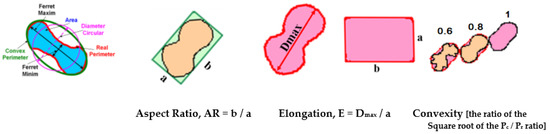 Figure 2 shows the graphite particle size parameters and shape factors considered in the present work. The simple shape factors, such as the Aspect Ratio-AR and Elongation-E, refer to the maximum and minimum size of graphite particles, while the Convexity-Cv compares their Convex (Pc) and Real (Pr) perimeters. More complex graphite shape factors include the graphite particle area (AG) and one other representative parameter, such as the Maximum Ferret-Fmax (Roundness Shape Factor-RSF, Equation (1)), the Convex Perimeter-Pc (Compactness Shape Factor-CSF, Equation (2)) or the Real Perimeter-Pr (Sphericity Shape Factor -SSF, Equation (3)).