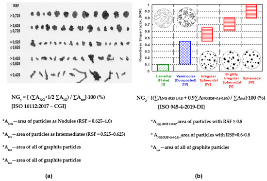 Calculus of the Graphite Nodularity (NG) depending on the Roundness Shape Factor (RSF) according to ISO 16112-2017-CGI (a) and ISO 945-4-2019-DI (b).