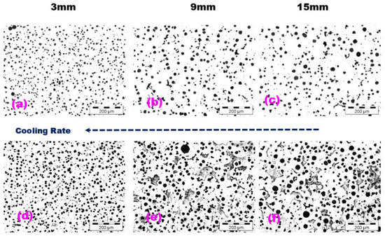 Typical microstructures of the wedge casting at the 3, 9, and 15 mm section sizes, without and with Nital etching, are shown in Figure 5. For all of the considered solidification cooling rates induced by wall thickness variation, the un-inoculated, 4.5%Si ductile cast iron shows a ferrite–pearlite matrix (at different ferrite/pearlite ratios), without free carbides and with mainly nodular (spheroidal) graphite phase, but with size and morphology.