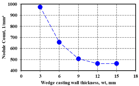 Figure 6 shows the strong influence of the wedge casting wall thickness (lower section size, higher solidification cooling rate) on the nodule count, in the present test conditions, for 4.5%Si-alloyed ductile cast iron and from 3 up to 15 mm casting section size. More than 900 nodules per square millimeter resulted in the smallest casting section size (3 mm), 600–700 for the 6 mm casting section size, and 450–500 for the 9–15 mm casting section size.