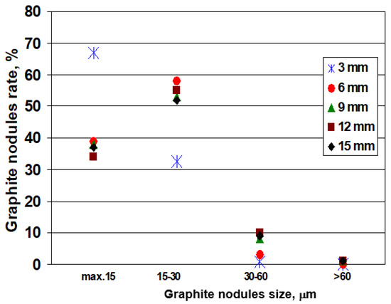 Figure 7 illustrates the influence of the wedge-casting wall thickness on the graphite nodules size rate distribution. Generally, the decrease in the casting section size (solidification cooling rate increases) favors the increase of the rate of lower graphite nodule size. More than 90% of graphite nodules are less than 30 μm, with a visible peculiar position of 3 mm section size: 65–70% less than 15 μm size and 30–35% at a rate of 15–30 μm nodules size. The second values group brings together 6–15 mm casting section sizes, with 30–40% nodules less than 15 μm and 50–60% nodules at 15–30 μm size, respectively.