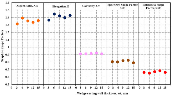The graphs included in Figure 9 show the evolution of other graphite shape factors (defined by Figure 2) as an influence of the wedge-casting wall thickness. As general values, the considered graphite shape factors fall within a narrow field, for the entire range of the wedge casting section size: Aspect Ratio AR = 1.32–1.39, Elongation E = 1.37–1.48, Convexity Cv = 0.91–0.92, Sphericity SSF = 0.79–0.82, Roundness RSF = 0.65–0.68. The Roundness Graphite Shape Factor (RSF), which is considered (by the international standard ISO 945-4-2019) to characterize the representative graphite morphologies in cast irons (Figure 3b), suggests a fall within the slightly irregular spheroidal graphite (Form V ISO 945), in the 4.5%Si ductile cast iron test. For RSF < 0.7, it practically is at the lowest level of the compactness degree defined by this standard (RSF = 0.6–0.8).