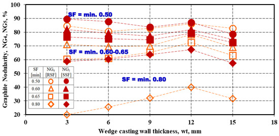 Graphite nodularity was basically calculated by considering the Roundness Shape Factor (RSF), according to ISO 16112:2017, applied for the compacted graphite cast iron (NG1-Figure 3a and Figure 4) and to ISO 945-4-2019, applied for the ductile cast iron (NG2-Figure 3b and Figure 4). The results obtained are illustrated in Figure 10, with the wedge-casting wall thickness as a possible