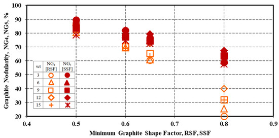 Figure 12 shows the influence of the minimum imposed graphite shape factors (RSF, SSF) on the graphite nodularity NG4 and NG5 and the wedge-casting wall thickness. This figure shows not only the decrease of the graphite nodularity by the increase of the claims on the graphite phase compactness degree but also the increasing difference expressed by the RSF or SSF parameters contribution. The difference is less visible for a min. 0.5 value, then it continually increases between NG4 and NG5, up to the minim. 0.8 level of graphite shape factor (from 10 up to 35% graphite nodularity difference).
