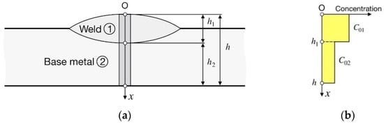 Let us consider hydrogen diffusion in a welded joint combining different materials conventionally named ferrite F (low-carbon low-alloy steel), martensite M (alloyed steel) and austenite A (high-alloy steel). Let the diffusion coefficients at a temperature of 293 K be 1.50 × 10−9 m2⋅s−1 for F, 1.58 × 10−10 m2⋅s−1 for M, and 3.98 × 10−15 m2⋅s−1 for A and the hydrogen solubility in γ-Fe (A) relative to α-Fe (F and M) is k0 = 4013. The D and k0 values correspond to iron, 2.25Cr-1Mo steel, and 347 stainless steel [13]. Hence, the diffusion coefficient in a quenched steel M is one order of magnitude less than that in a non-quenched steel F and five orders of magnitude greater than that in austenitic steel A. The weld thickness is h1 = 4 mm and the joint thickness is h = 10 mm (Figure 1a). Let the initial hydrogen concentration be C01 in the WM and C02 = 0.1 C01 in the BM, unless otherwise specified.