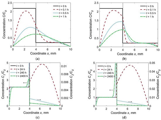 Distribution of relative hydrogen concentration in welded joints at different time t: (a) F + F, C02/C01 = 0.1; (b) F + M, C02/C01 = 0.1; (c) A + M, C02/C01 = 0.1; (d) A + M, C02/C01 = 1.