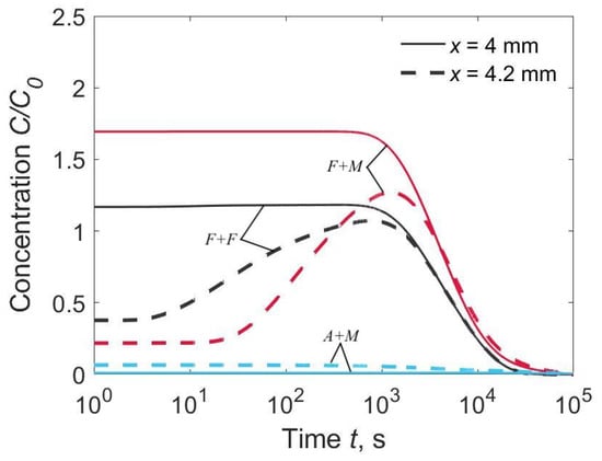 Three characteristic combinations of materials were under consideration: F + F (D1 = D2, k0 = 1), F + M (D1 > D2, k0 = 1) and A + M (D1 < D2, k0 = 4013). The first combination corresponded to a homogeneous joint with a WM chemistry that closely matches the BM. The second combination corresponded to the welding of alloyed steels with low-carbon non-alloyed welding consumables. The third combination corresponded to the welding of low-carbon alloyed steels with austenitic welding consumables. We determined the time-dependent hydrogen diffusion from the distribution of hydrogen over thickness (Figure 2) and the local concentration at the weld interface (x = h1) and at the HAZ (x = h1 + 0.2 mm, Figure 3).