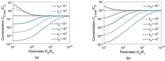 Comparative analysis of Equations (9)–(14) proved that under the assumptions made, the peak concentration at the weld interface C2max(h1) depends only slightly on the plate thickness [10,11]. It follows from Equation (14):