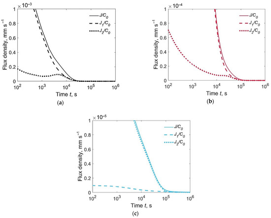 Figure 5 shows the relative fluxes J1(0,t)/C0, J2(h,t)/C0 and J(t)/C0. The flux of effused hydrogen is usually the maximum at the weld metal surface (curves J1(0,t)/C0, Figure 5a,b), but this is not valid for an inhomogeneous joint with an austenitic weld metal and martensitic base metal (Figure 5c). In the latter case, the diffusion coefficient in the WM is several orders of magnitude lower than in the BM, due to which the hydrogen flux through the lower surface turns out to be noticeably greater than the flux through the weld surface, despite the significantly lower initial hydrogen concentration in the BM.