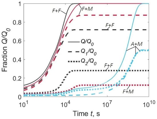 Fraction of hydrogen evolved from the upper surface (Q1/Q0), lower surface (Q2/Q0), and both surfaces (Q/Q0) for welded joints of three types: F + F, F + M, and A + M. C02/C01 = 0.1.