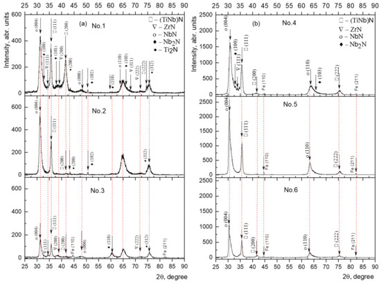 - It was established that the (TiZr/Nb)N multilayer coating consists of a solid solution of (TiNb)N and ε-NbN with an FCC structure. Based on the phase composition data, it can be assumed that an increase in the number of bilayers leads to a decrease in the concentration of nitrogen in the bilayers and, consequently, to a decrease in the volume fraction of ε-NbN and β-Nb2N nitrides and the appearance of a weak peak of the solid solution of (TiZr)N;