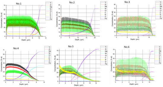 - It was determined that an increase in the bias potential from −100 V to −200 V leads to an increase in the coating thickness (TiZr/Nb)N and is from 8–10 µm to 10–20 µm, respectively. It was also found that an increase in the deposition time of each individual layer at U = −100 V and p = 4 × 10−3 Torr leads to an uneven distribution of elements over the coating thickness and the formation of a relatively wide coating–substrate transition layer. Due to the shorter relaxation time for redistribution of metal ions in the diffusion layer during the deposition of each layer, the modulation of elements in the composition will not be ideal, and the characteristics of the coatings are close to a monolithic alloy, not multilayer structure;