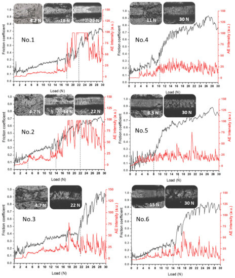 - Shugurov, A.R.; Akulinkin, A.A.; Panin, A.V.; Sergeev, V.P.; Kalashnikov, M.P.; Voronov, A.V.; Cheng, C.H. Study of crack resistance of TiAlN coatings by scratch testing. Phys. Mesomech. 2017, 20, 185–192. [Google Scholar] [CrossRef]