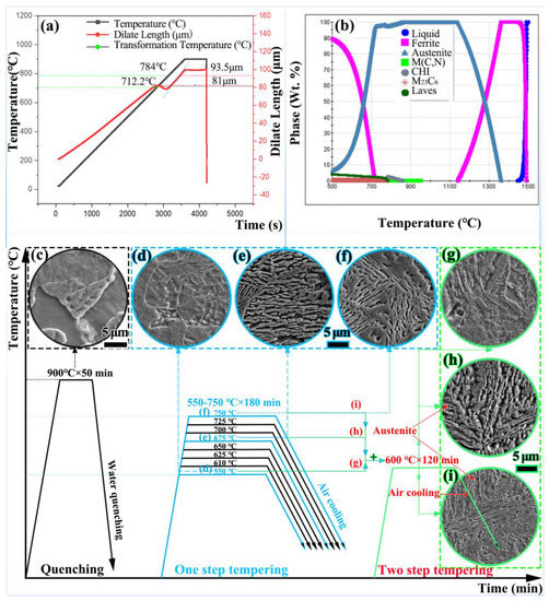 (a) Thermal dilatometric curve; (b) equilibrium phase diagram; (c–i) microstructure evolution.