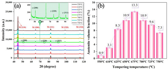 (a) X-ray diffraction patterns of the experimental steel treated by quenching and double-step tempering treatment; (b) the volume fraction of reversed austenite.