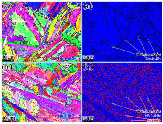The inverse pole figure (IPF) and phase maps of the samples for the one-step tempering at 675 °C for 180 min and the first stage of double-step tempering at 675 °C for 180 min are shown in Figure 3. They distinctly reveal that there was no austenite on lath martensite (Figure 3a1). However, the IPF shows a small variation in the width of the martensite lath for double-step tempering heat treatments. In the double-step tempered specimens, the volume fraction of reversed austenite remarkably increased.
