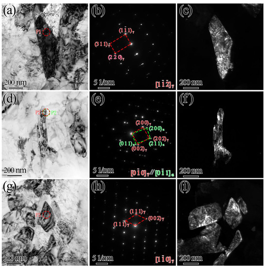 TEM images in double-step tempered samples: (a–c) 625 °C (3 h) + 600 °C (2 h); (d–f) 675 °C (3 h) + 600 °C (2 h); (g–i) 700 °C (3 h) + 600 °C (2 h); (a,d,g) bright-field images; (b,e,h) SAED patterns; (c,f,i) dark-field images.