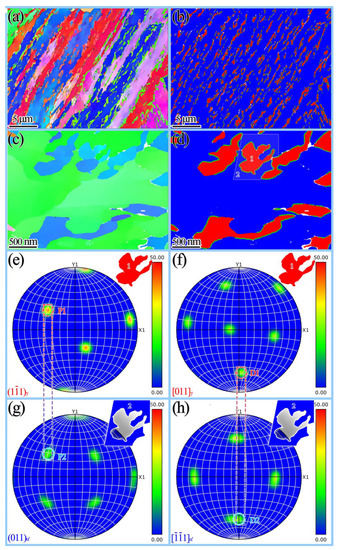 Crystallographic orientation relationship assay of two phases by TKD for the sample tempered at 675 °C (3 h) + 600 °C (2 h): (a) IPF; (b) K-S orientation relationship of the martensite and reversed austenite phase (martensite in blue and austenite in red); (c) IPF (high amplification); (d) K-S orientation relationship of the martensite and reversed austenite phase (high amplification, martensite in blue and austenite in red); (e–h) the pole figures of reversed austenite and martensite.