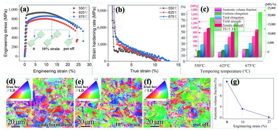 (a) The tensile engineering stress–strain curves; (b) strain hardening rate curves; (c) The value extracted from tensile curves; (d–f) inverse pole figure of martensitic; (g) volume fraction of reversed austenite obtained via putting off, interruption at 10% strain and unstrained, respectively.