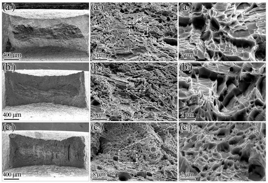 Fracture morphology analysis of different tempering temperatures is shown in Figure 7. Different tempering temperatures lead to different volume fractions of reversed austenite, resulting in differences in fracture morphology, which can objectively reflect the level of strength and plasticity. After undergoing tempering at 675 °C (3 h) + 600 °C (2 h), the sample had a better PSE that was 23.5 GPa·% higher than other samples, achieving uniform elongation of 10.4% and total elongation of 27.2%. The increase in elongation was confirmed by SEM observation of fracture morphology; toughness characteristic dimples are fairly shown in Figure 7c3. The larger the dimple size (diameter and depth), the better the plasticity of the material. These dimples may generate from the interfaces between the fresh martensite and martensite matrix due to strength differences [24,40,41]. The plasticity of the sample tempering at 675 °C (3 h) + 600 °C (2 h) significantly improved, showing the maximum volume fraction of reversed austenite. In the process of tensile and fracture, the reversed austenite hindered crack propagation and it was necessary to continuously consume energy, causing significant plastic deformation.