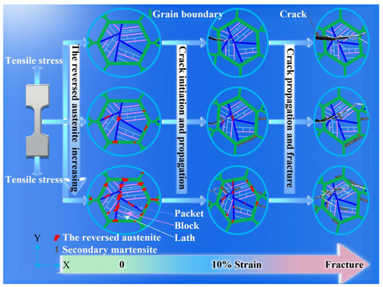 As shown in the schematic diagram in Figure 8, fine reversed austenite played an obvious role in tensile deformation. When the crack propagated to the reversed austenite phase, the austenite consumed a large amount of deformation work and made the crack tip blunt, which hindered the further propagation of the crack and thus increased the total elongation and toughness. TRIP effect, consuming the plastic energy at the tip of the microcrack [44], alleviated local stress concentration and hindered crack initiation and propagation [45].
