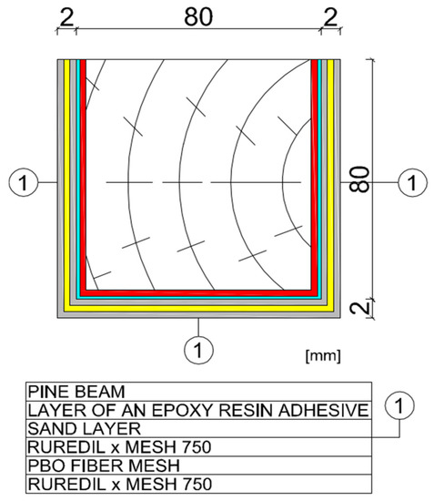 In FRP systems (Fiber Reinforced Polymers), the composite is joined with timber by means of a matrix made of epoxy resin, which is the link between the reinforced element and the reinforcement and is most often in the form of fibers. Unfortunately, the mechanical properties of the FRP system depend mainly on the temperature, and particularly on the glass transition temperature of the epoxy resin, in the range of 40–80 °C, which is what determines the durability and effectiveness of the reinforcement, regardless of the fibers used. When the glass transition temperature is exceeded, the matrix loses its properties and the FRP system becomes an ineffective reinforcement. In response to this problem, the FRCM (Fiber Reinforced Cementitious Matrix) system was developed, in which the resin matrix was replaced with a mineral mortar [24,25]. One of the most commonly used reinforcement materials in this system is a mesh made of PBO (p-Phenylene benzobis oxazole) fibers. However, this system is also burdened with imperfections resulting from the sliding effect occurring between the mineral mortar and the fibers. This is due to the mortar not able to cover all fibers exactly like epoxy resin. Thus, premature detachment of the fibers from the matrix takes place, which in turn leads to incomplete use of the mechanical properties of PBO fibers. This can be remedied by using additional PBO mesh anchors, which can prevent premature fiber detachment and thus increase the capacity utilization of the PBO mesh.