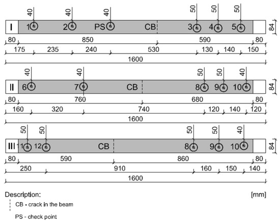 As mentioned earlier, the beams in question were subjected to a destructive test [27], and the test results of which, together with the arithmetic mean of the pull-off strength for stages I and II, are shown in Table 6.