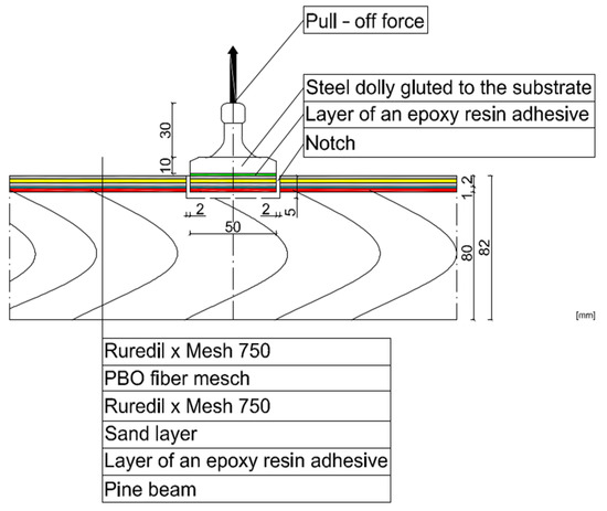 Many existing structures require strengthening and retrofitting. This aspect is very important due to the deterioration of structures, changes in using increasing design requirements, or functionality of these structures. In the case of concrete structures, the traditional methods of strengthening are still the most popular. In this case, the traditional materials such as concrete or steel are well known and very common in practical application. For several years, methods using carbon fiber reinforced polymer composites (CFRP) have been very popular. These materials exhibit great mechanical characteristics and high durability [1,2,3,4,5,6,7,8]. These methods of strengthening are adequate to methods from this paper, where the pull-off adhesion strength of the FRCM-PBO (Fiber Reinforced Cementitious Matrix-p-Phenylene benzobis oxazole) composite to timber was analyzed. Timber is one of the oldest building materials. It is a truly ecological material, fully renewable and healthy, and environmentally friendly as it takes carbon dioxide from the atmosphere. Its use in construction has a positive effect on unfavorable climate changes. As it is commonly known, timber is an anisotropic material, i.e., physical and mechanical properties change depending on the considered direction, which (in engineering terms) means the dependence of tensile, bending and compression strength on the direction of the force in relation to the direction of the fibers [9,10]. The timber shows the best mechanical parameters along the grain. In combination with its low structural density, timber structures are relatively light, which allows the construction of structures with large spans and heights. Timber constructions, however, are not without their drawbacks. Like other building materials, they require repair or strengthening as they age. According to Masłowski [11], the reinforcement of timber structures may result, among others, from atmospheric, chemical and biological factors, temperature changes, destructive activities of the environment, design and construction errors. Additionally, after a certain period of use the requirements of the user of the object may have changed and the current load-bearing capacity of the object is insufficient. Therefore, it is necessary to take appropriate measures to obtain a higher load capacity.